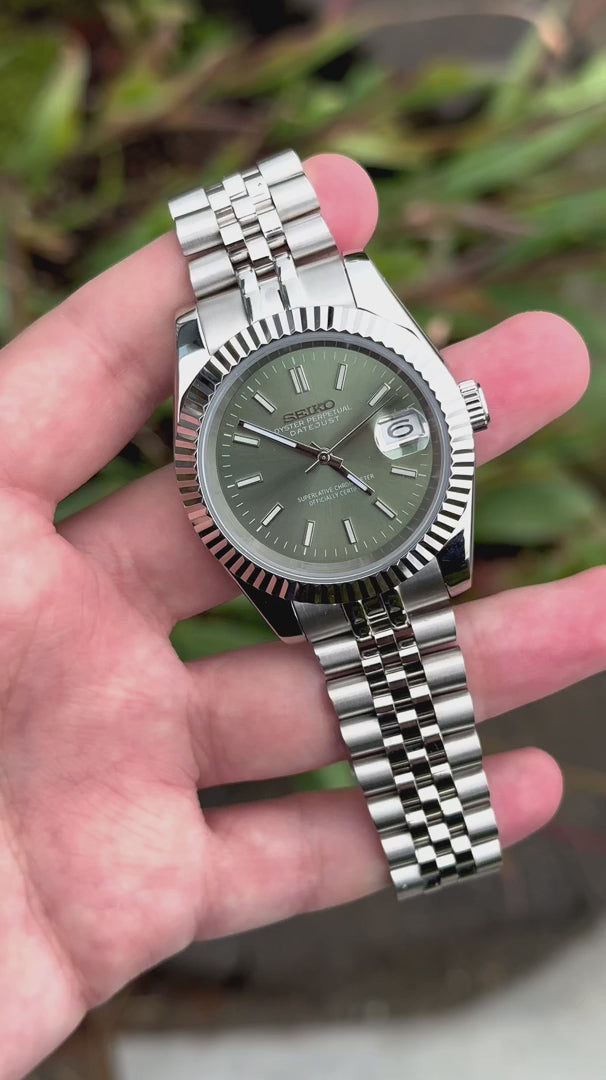 Handcrafted and assembled by our in-house watch experts, the Seiko Datejust Mod is powered by the dependable NH35 automatic movement. Inspired by the iconic Datejust design, this mod features the classic fluted bezel, date display, and a sleek, refined dial. Paired with the timeless Jubilee bracelet, it offers both comfort and sophistication. This watch is the perfect blend of Seiko's precision and the enduring elegance of the Datejust style.
