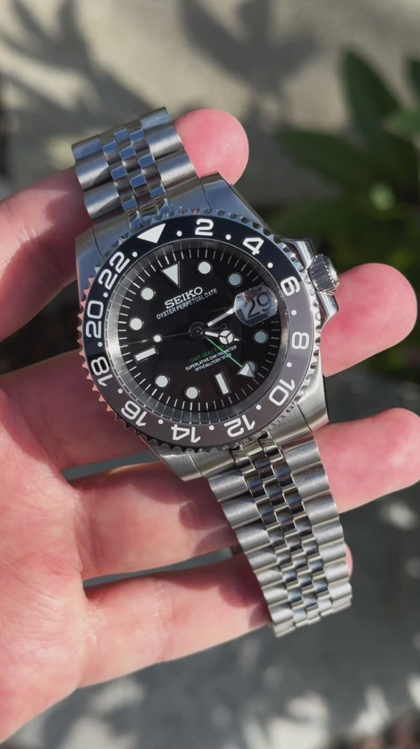 Handcrafted and assembled by our in-house watch experts, the Seiko GMT Mod is driven by the reliable NH34 movement, offering seamless GMT functionality for tracking multiple time zones. Inspired by the iconic GMT design, this mod features the distinctive 24-hour bezel and a bold, legible dial, perfect for international travelers and watch enthusiasts alike. With its durable stainless steel case and versatile look, this watch combines style with practicality for those always on the move.