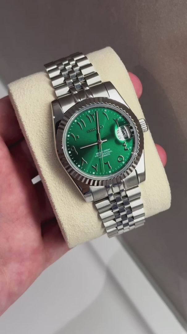 Handcrafted and assembled by our in-house watch experts, the Seiko Datejust Mod is powered by the dependable NH35 automatic movement. Inspired by the iconic Datejust design, this mod features the classic fluted bezel, date display, and a sleek, refined dial. Paired with the timeless Jubilee bracelet, it offers both comfort and sophistication. This watch is the perfect blend of Seiko's precision and the enduring elegance of the Datejust style.