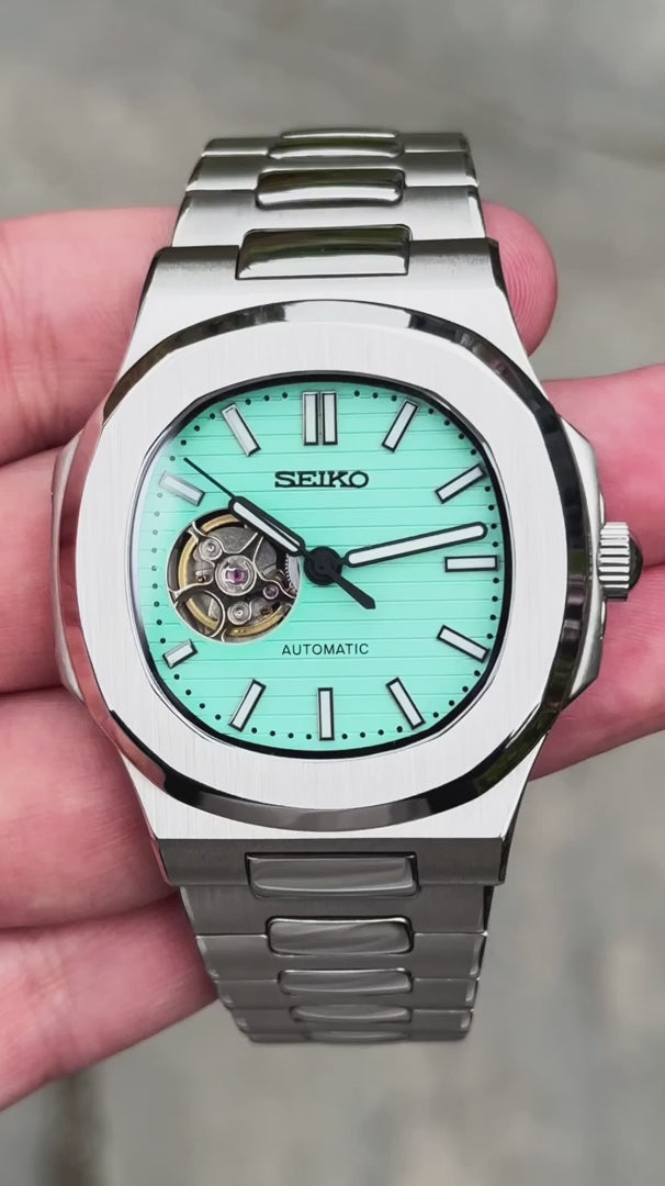 Handcrafted and assembled by our in-house watch experts, the Seiko Nautilus Mod features the trusted NH38 movement for reliable automatic performance. Inspired by the iconic Nautilus design, this mod showcases the signature porthole-shaped case, sleek horizontal dial pattern, and integrated bracelet, capturing the essence of timeless luxury. With its refined stainless steel build, this watch is the perfect fusion of Seiko’s precision and the legendary Nautilus aesthetic.