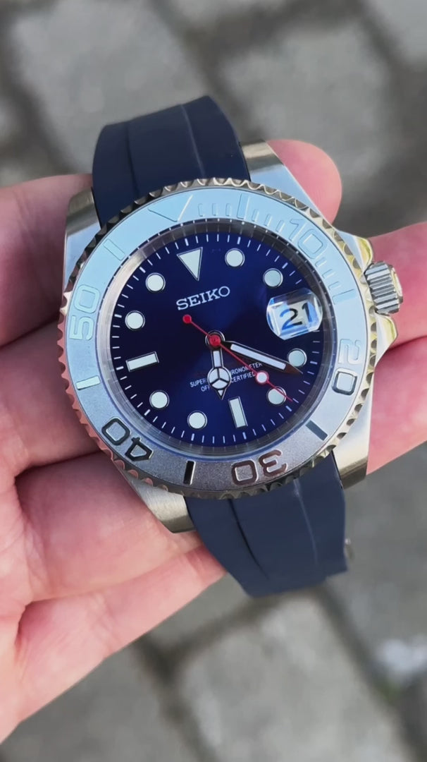 Handcrafted and assembled by our in-house watch experts, the Seiko Yacht-Master Mod is powered by the NH35 automatic movement. Inspired by the iconic Yacht-Master design, this mod features the signature bi-directional rotating bezel, bold hour markers, and sleek, sporty dial, delivering both luxury and functionality. Built with a robust stainless steel case, it combines Seiko’s renowned precision with the timeless, nautical elegance of the Yacht-Master, making it perfect for maritime adventures and everyday wear.