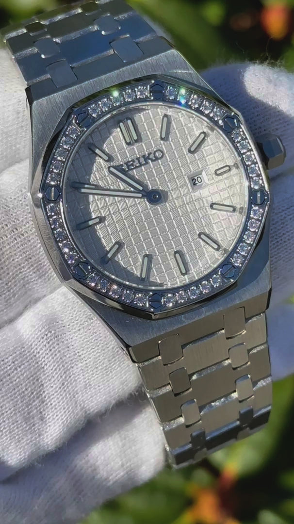Handcrafted and assembled by our in-house watch experts, the Seiko White Diamond Royal Oak Women Mod is driven by the VJ24 movement. With its iconic octagonal bezel, sturdy stainless steel case, and reliable chronograph functionality, this dive-ready timepiece combines Seiko’s precision with rugged elegance, perfect for the depths and beyond. Every women perfect companion.